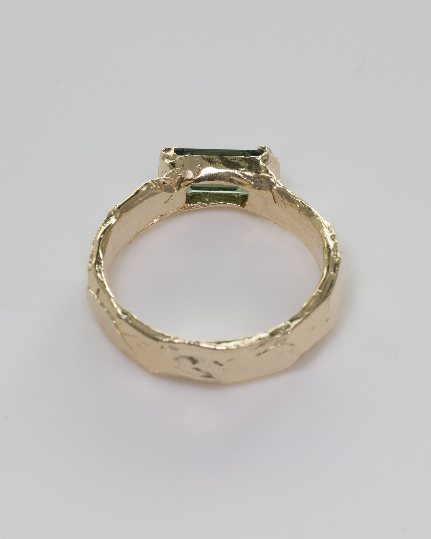 Australian green emerald baguette ring with an earthy hue that reflects its origin. The emerald sits in a unique, floaty setting on a soft construction, creating a minimal, one-of-a-kind ring that feels both grounded and light to wear Ð a quiet choice for an alternative engagement ring or a singular cocktail ring.
