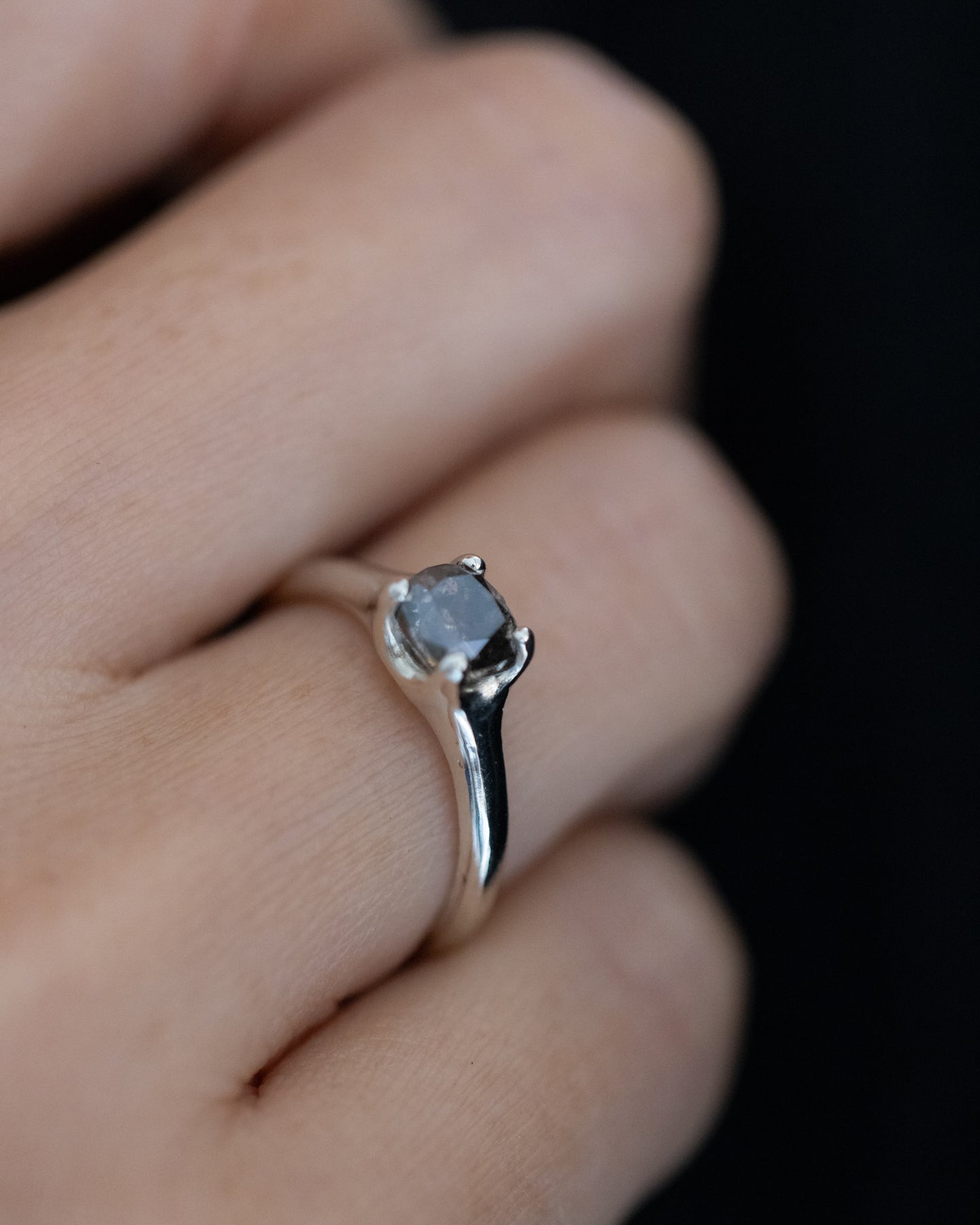 A single salt and pepper diamond set in recycled 9ct white gold. The stone sits in a minimal, floaty solitaire setting, lifted just off the band for a light, airy feel. A quiet, modern choice for an alternative engagement ring or an everyday diamond ring.