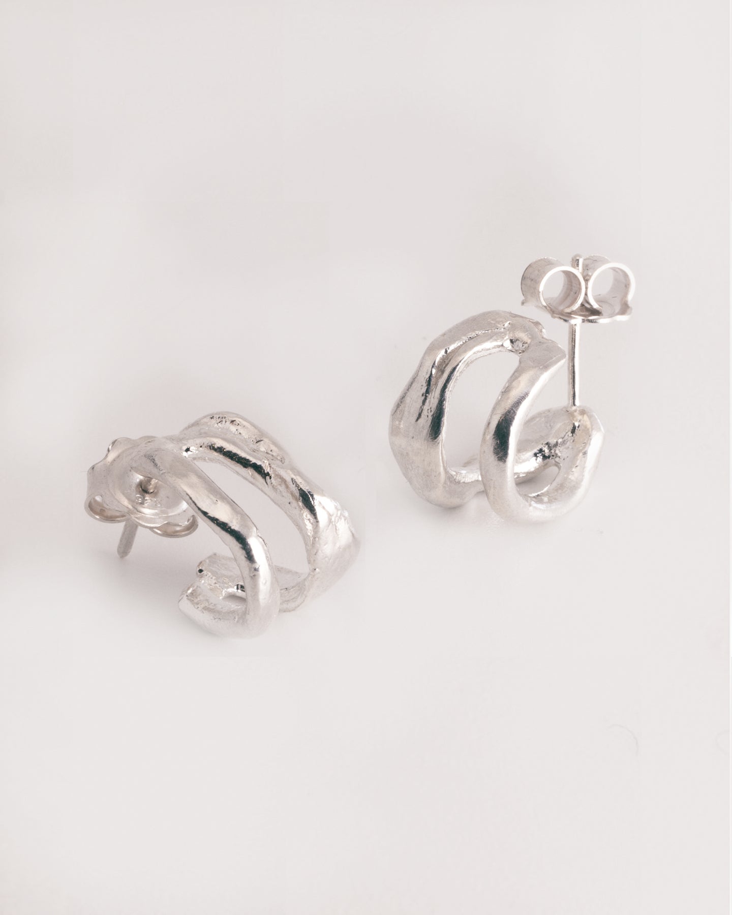 Sculpted huggie earrings with weathered, shoreline surfaces - light on the ear, deliberate in line. They catch a quiet gleam like water on stone. Minimal, tactile, and designed for everyday wear.