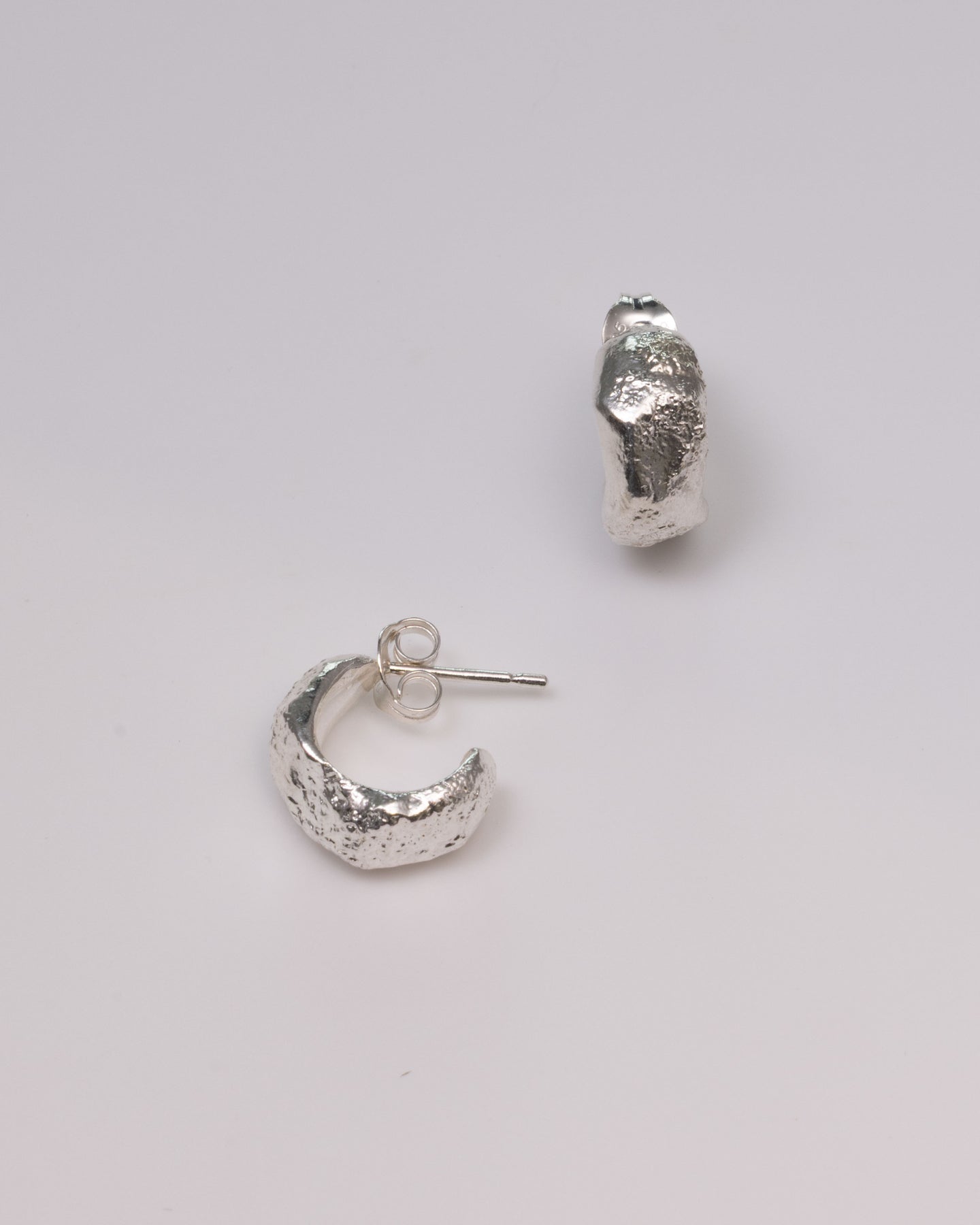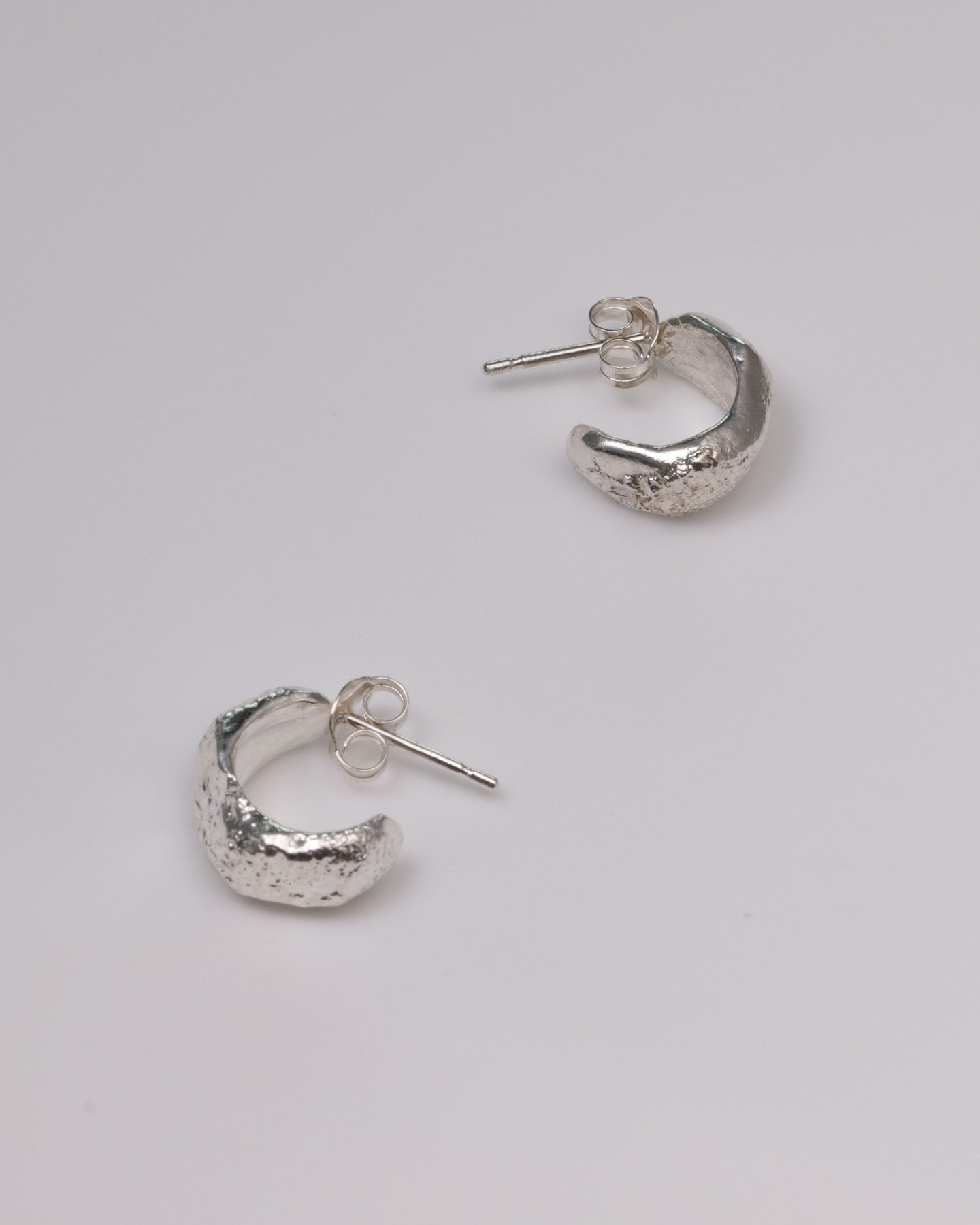 Coastal-inspired double-hoop huggie earrings with a softly weathered texture. Hand-finished in recycled sterling silver for everyday comfort. Light on the ear, secure in wear, and quietly luminousÑlike light on the ocean
