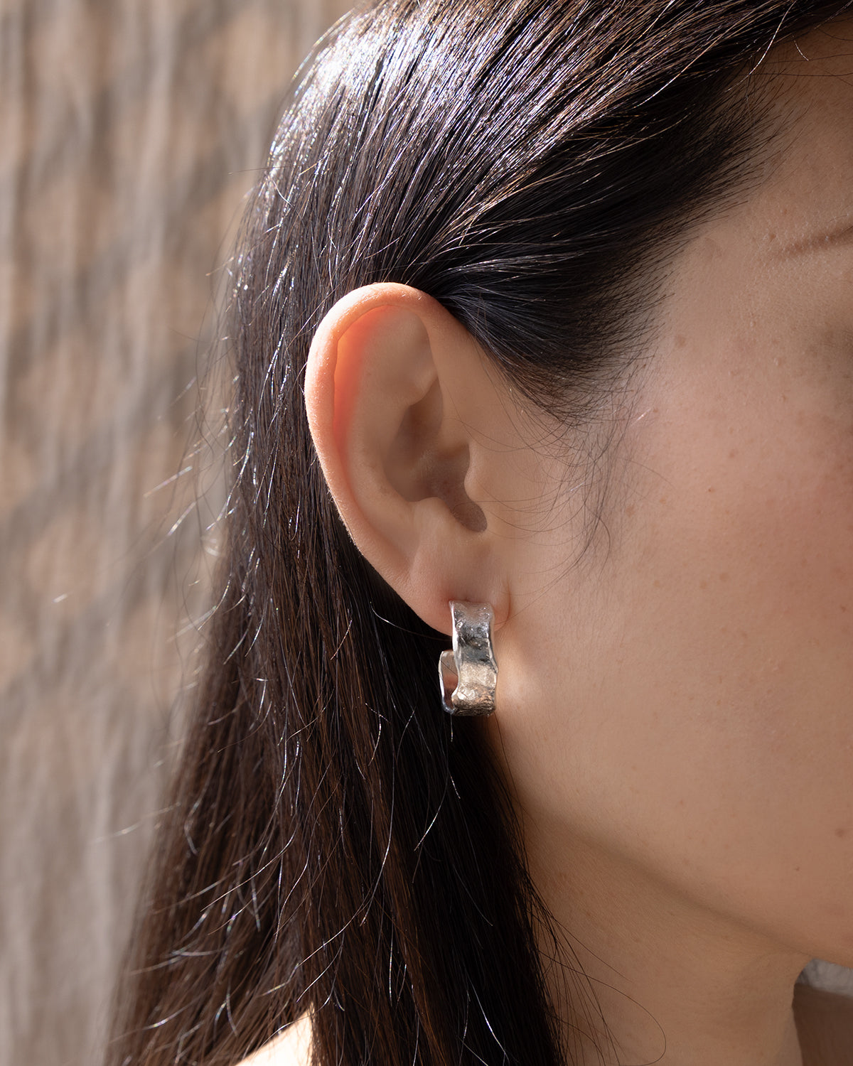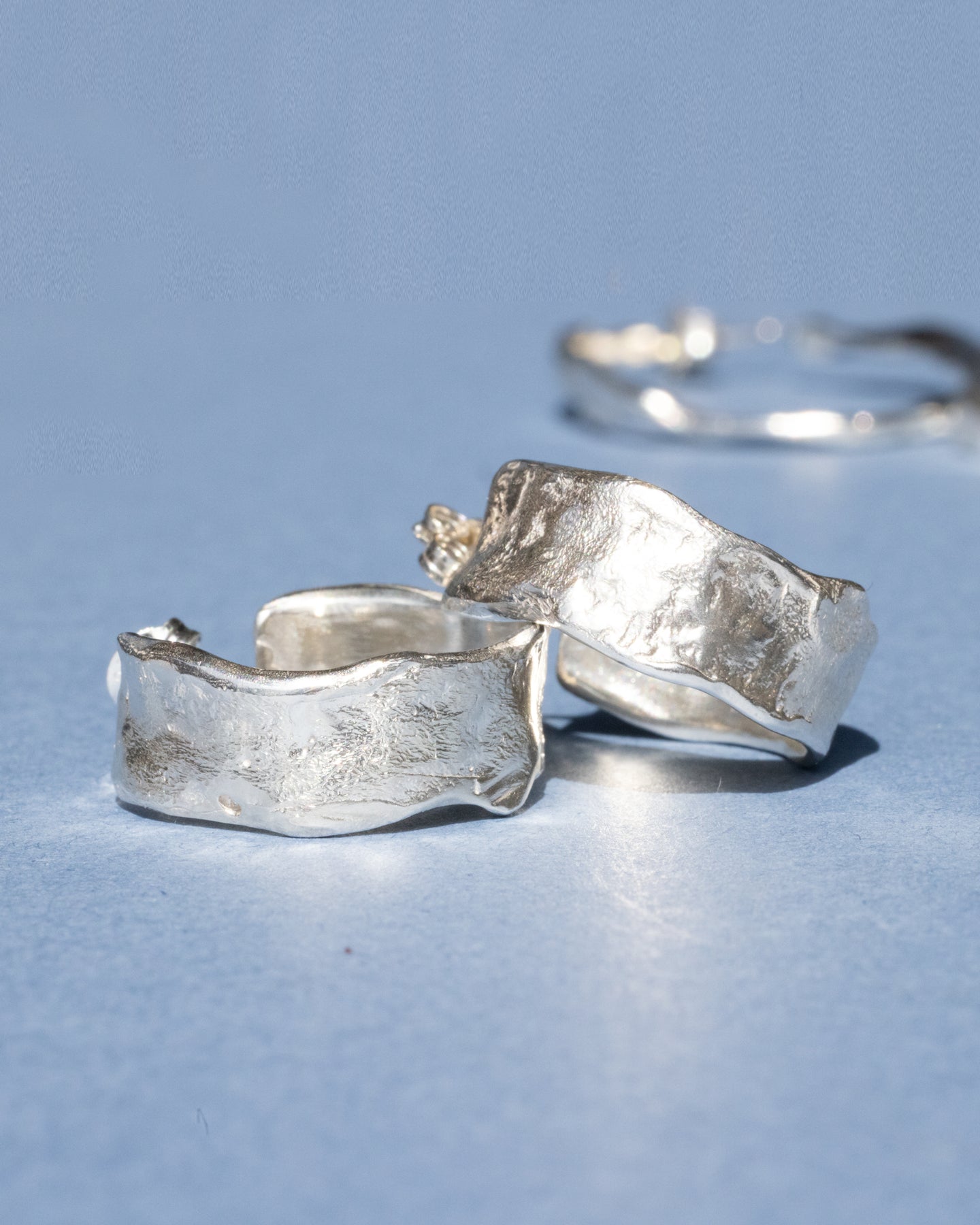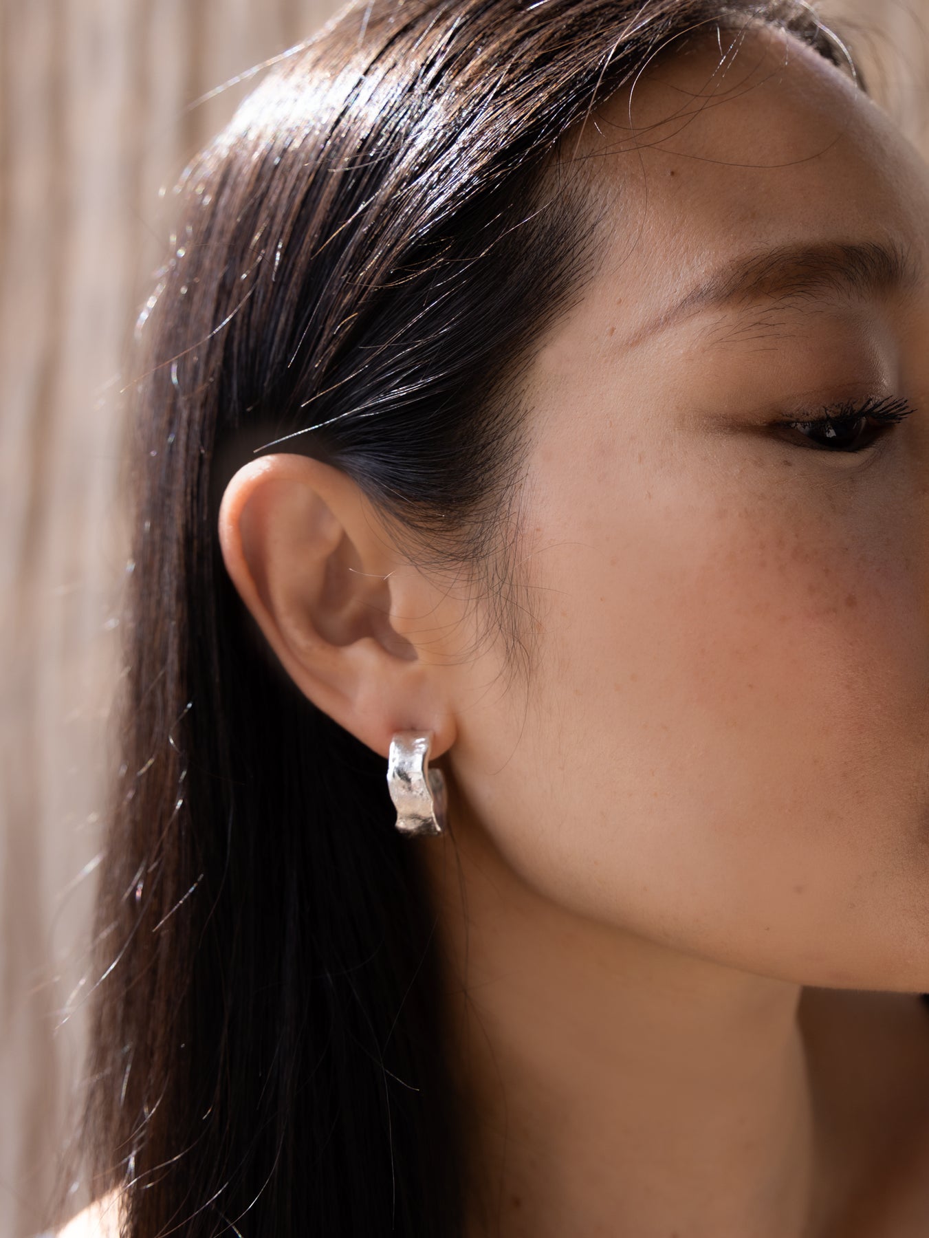 Weathered textured hoops, grounded in the coast and pared back for the city. Organic, chunky curves with a tide-worn surface—minimal, tactile, and quietly bold. Light on the ear, like the reflection on the ocean.